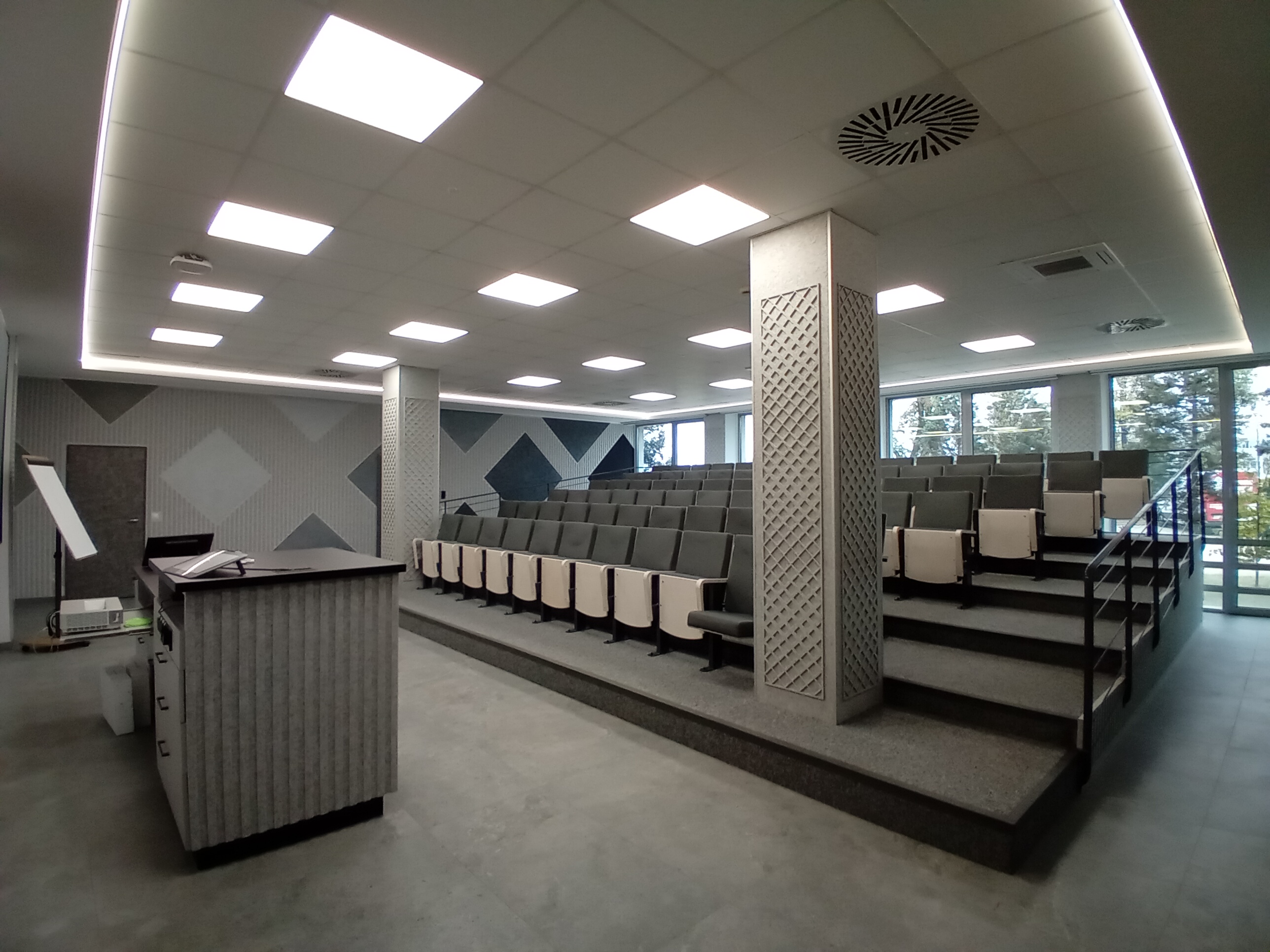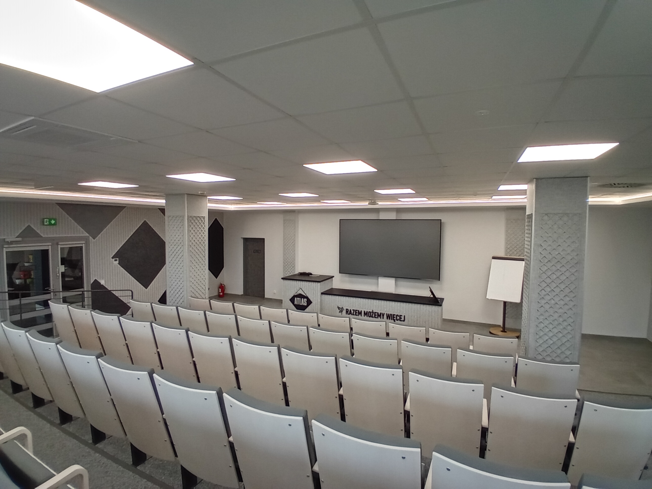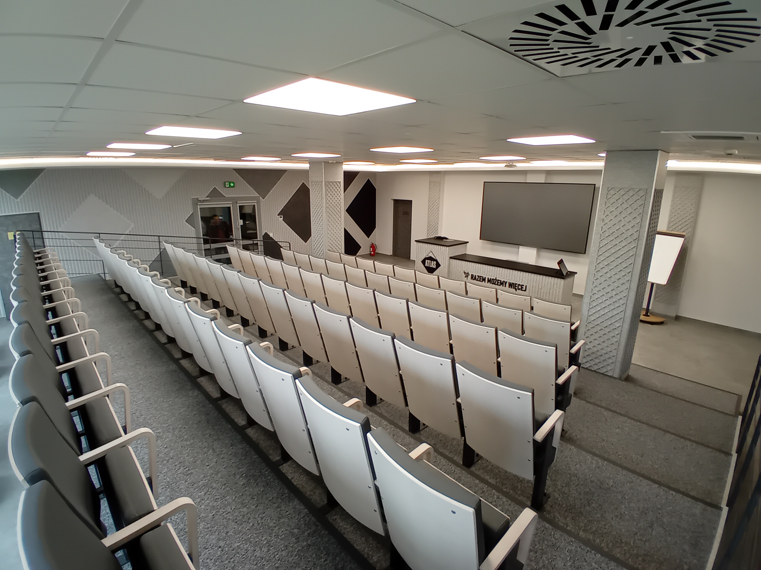 Aula wykładowa: parter, dla 75 osób, układ teatralny, światło dzienne, automatyczne rolety, klimatyzacja, projektor, ekran multimedialny, nagłośnienie, flipchart, mównica, internet wi-fi